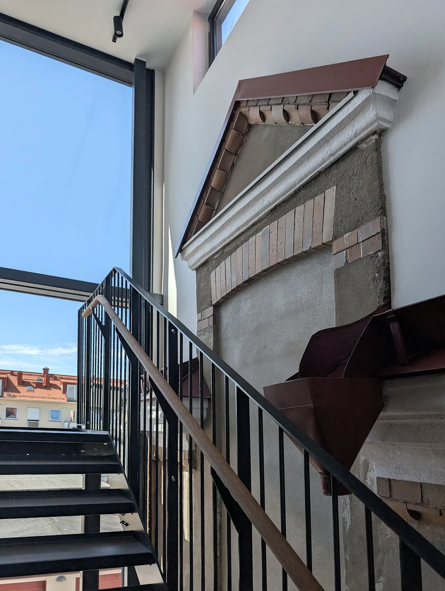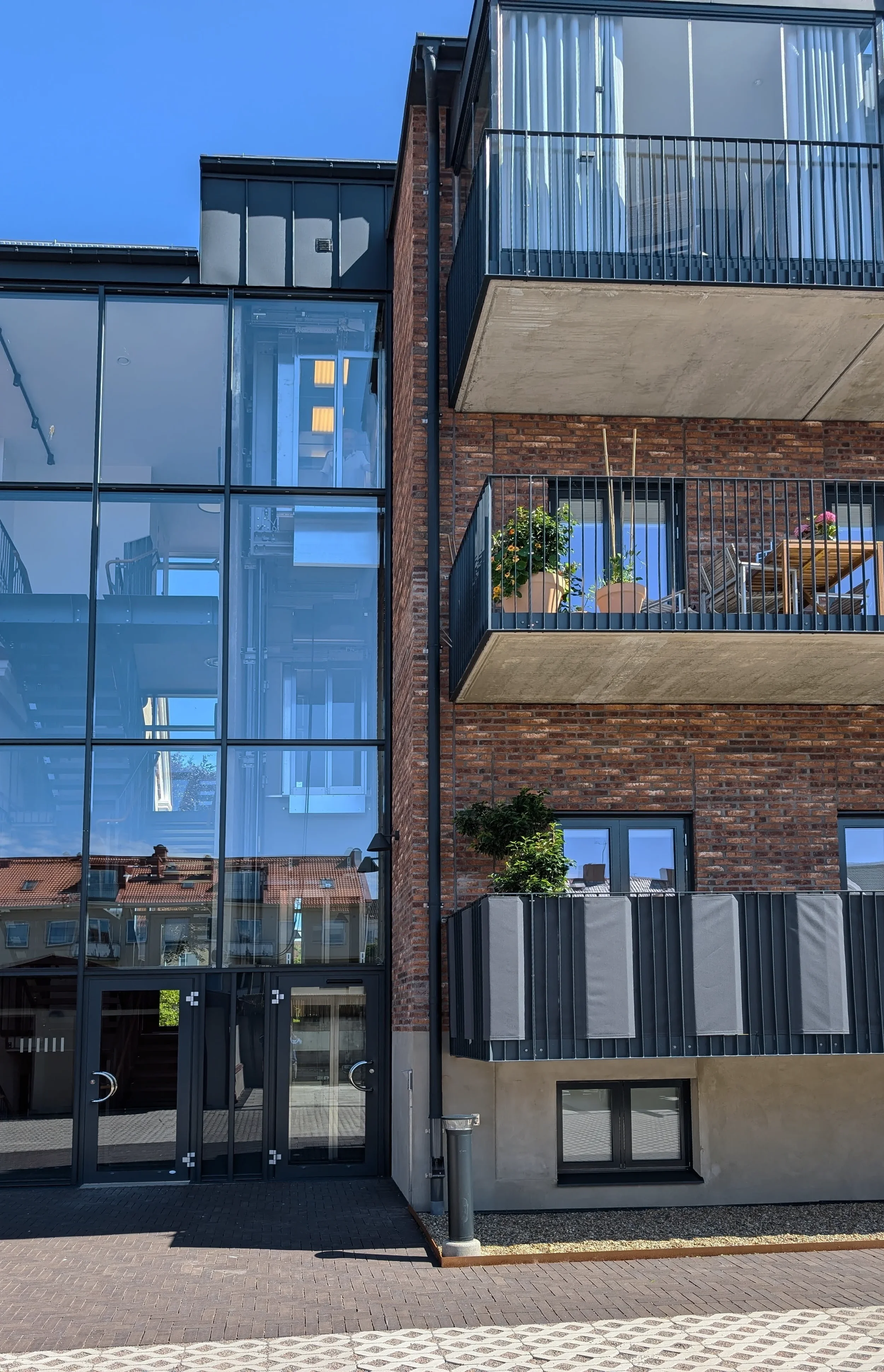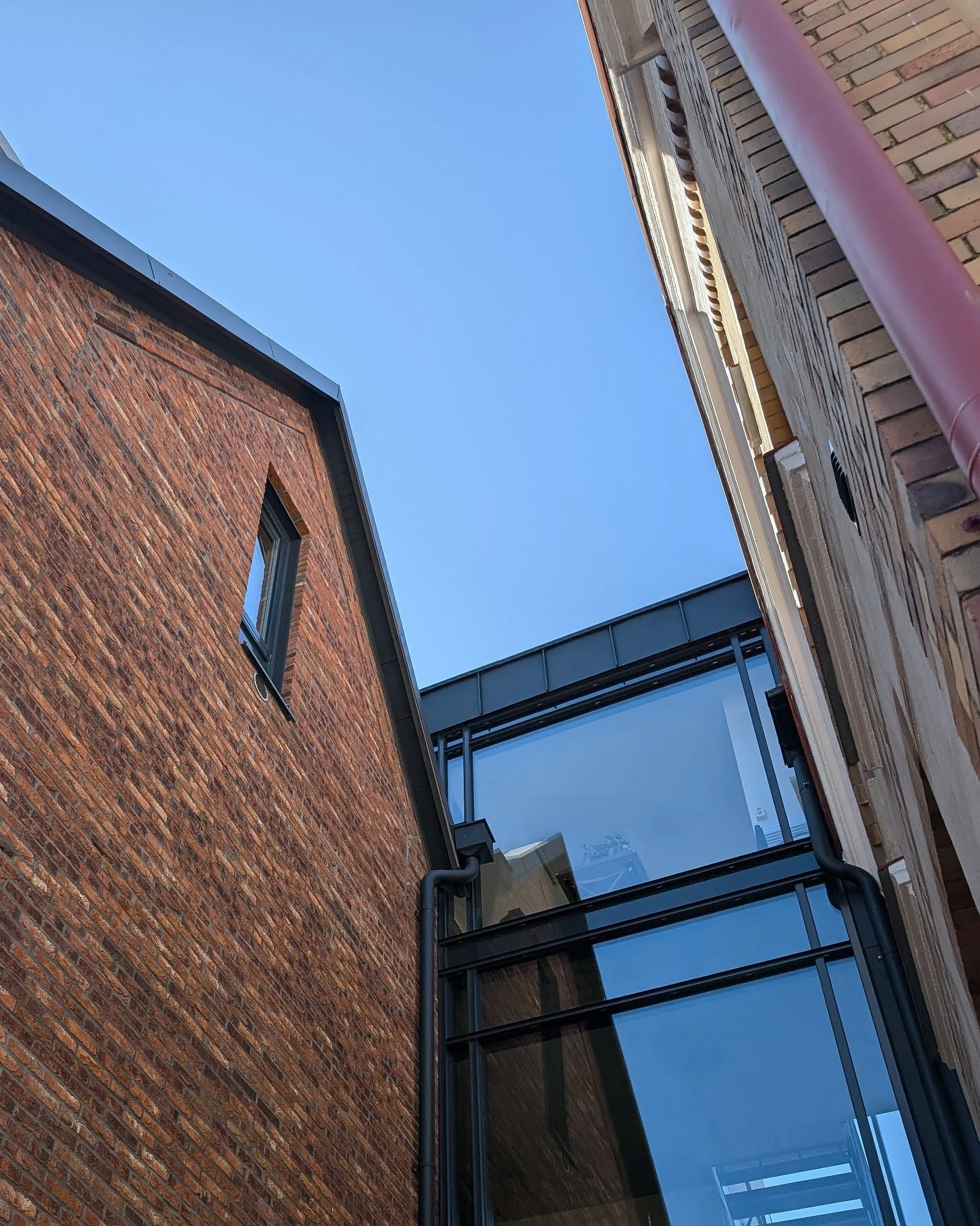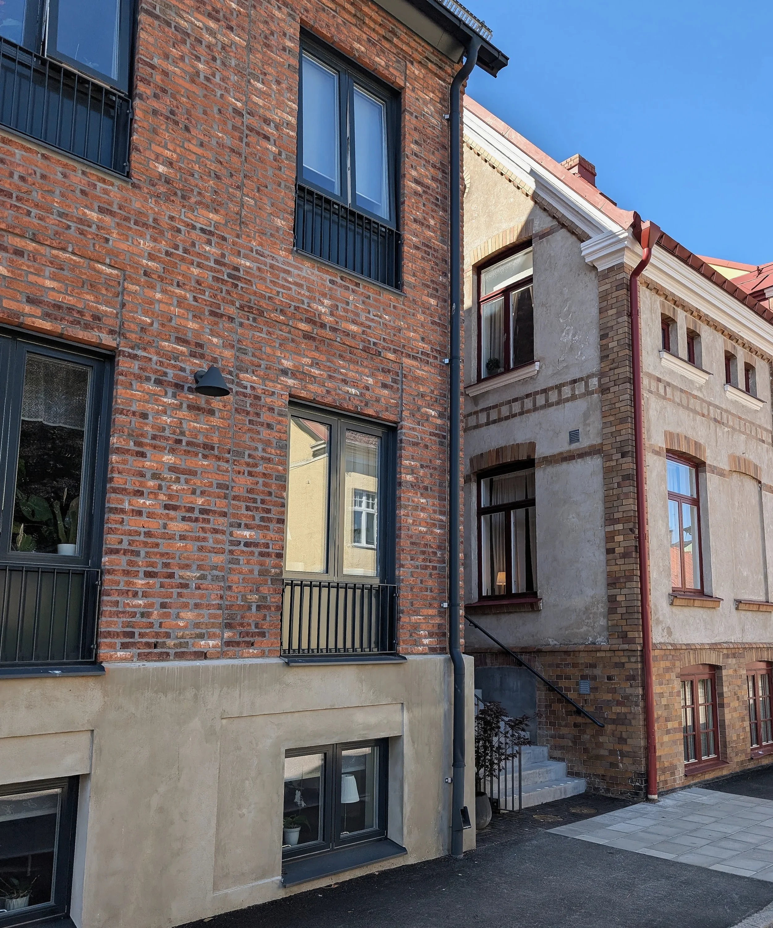 Byggnaden anpassades i skala och rytm för att passa in bland grannarna, men fick ett schatterat tegel som ger liv, djup och en diskret lek med ljuset. Gaveln sträcktes och förfinades, som en lätt bugning mot gatan. Mellan nytt och gammalt smög sig en glasdel in. Lagom avstånd men dock sammanhållet och en insida som hade patina och historia att berätta om.